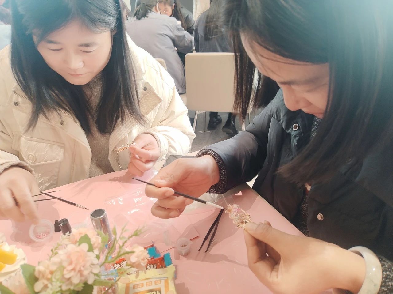 與此同時,常熟分公司的非遺螺鈿胸針制作活動,將傳統技藝融入現代職場。螺鈿工藝傳承人現場講解千年技藝的歷史與精髓,女員工們化身“巧手匠人”,在貝母的流光中雕琢匠心:挑選螺片、設計紋樣、鑲嵌打磨……方寸之間,花鳥紋樣盡顯江南雅韻,幾何構圖呼應現代審美。活動不僅讓員工體驗了非遺文化的魅力,更讓她們感受到公司對女性精神生活的重視。